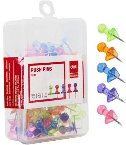 Deli Térképtű, DELI 0030, műanyag doboz, színes áttetsző (100 db/doboz) (TTD0030)