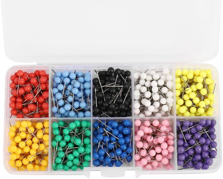 Gömbfejű táblatű, gombostű, színes jelölő tűk. Gömbfejő térkép jelölő tű. 50-50 db világoskék, királykék, zöld, sárga, narancssárga, fehér, fekete, lila, rózsaszín, piros térképtű.